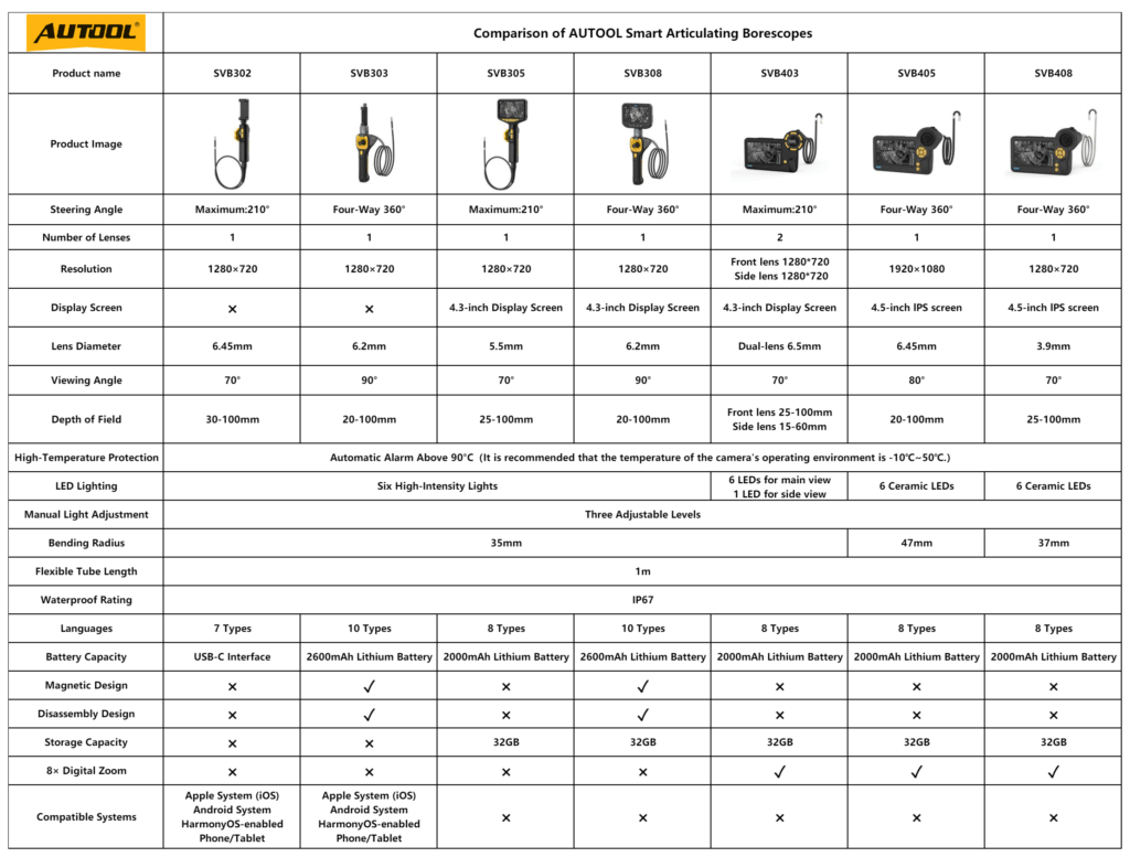 The AUTOOL Automotive Articulating Borescope utilizes optical and electronic imaging technologies. The front of the device is equipped with a miniature camera and an LED light source, which illuminates the target area and captures images. The camera transmits the image signal via fiber optics, cables, or wirelessly to a display device. After decoding, the signal is shown in real-time on the screen. Some models support functions such as image magnification, image inversion, and video/photo recording. The flexible probe is bendable, making it suitable for accessing complex, narrow structures. The automotive borescope is widely used for engine wear detection, pipeline blockage inspection, and hidden wiring observation, making it an essential tool for efficient and non-destructive testing.