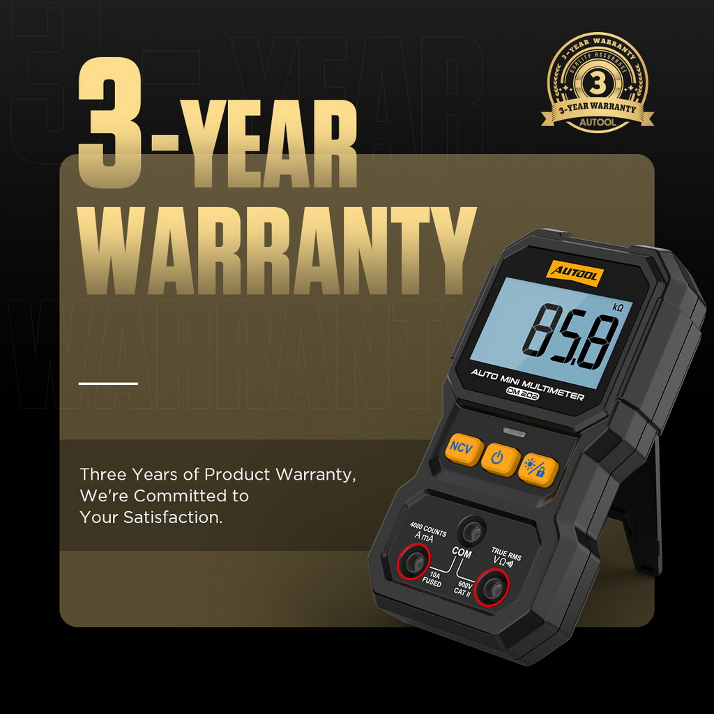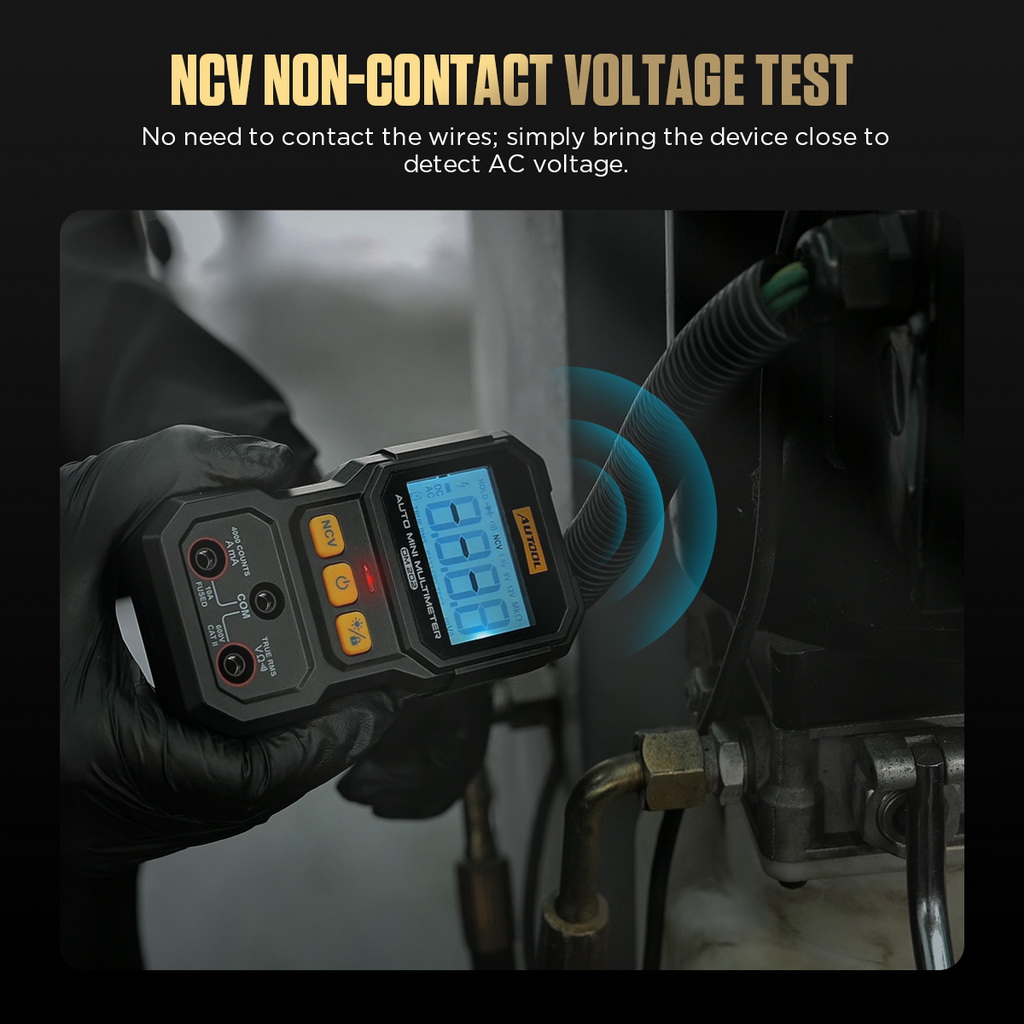The AUTOOL DM202 is a professional digital multimeter that can automatically detect the range and function without manual switching. It can measure AC/DC voltage, resistance, continuity, and true RMS values within 5 seconds. It also features NCV (Non-Contact Voltage) test, which can determine whether a circuit is live without touching the wires, easily distinguish live and neutral lines, and identify open circuit locations. Using a high-precision digital display and full-button design, it effectively avoids the wear or poor contact issues of traditional knobs. The screen supports 4-digit readings (up to 4000 counts), with the decimal point automatically shifting according to the selected range, making it suitable for testing various automotive electrical systems, circuits, and electronic components.