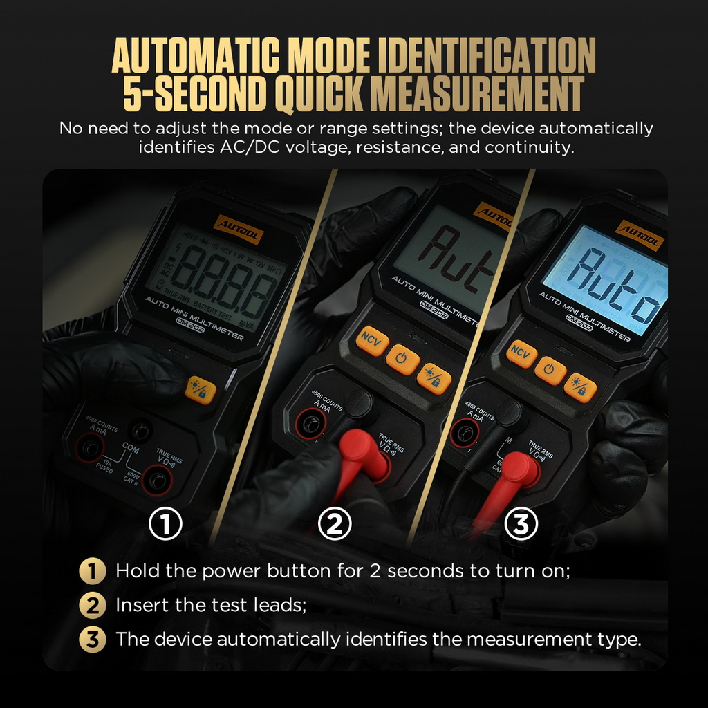The AUTOOL DM202 is easy to operate and requires no manual range switching. Simply place the test probes on the corresponding points of the circuit under test, and the device will automatically identify the measurement type (such as voltage, resistance, or continuity) and select the appropriate range. The entire testing process is completed in just 5 seconds, with results displayed on the screen in real time.