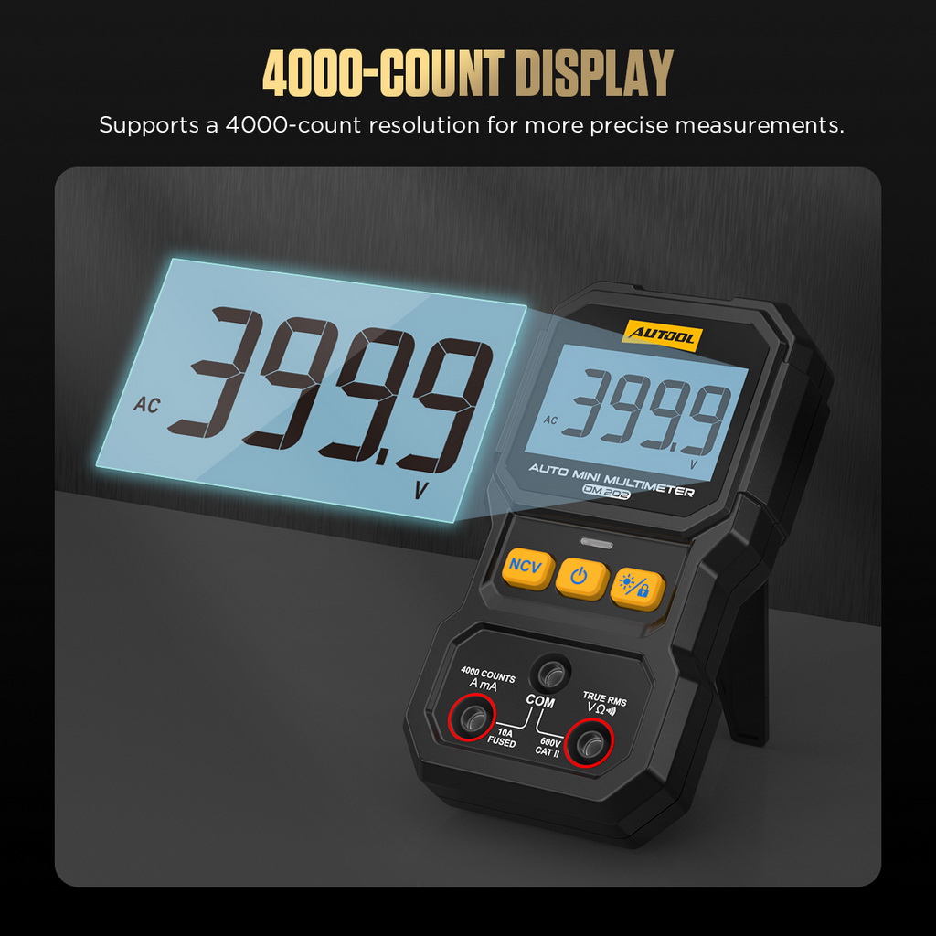 The AUTOOL DM202 features a high-precision 4000-count digital display with high resolution, enabling accurate measurement of electrical parameters such as voltage, current, and resistance.