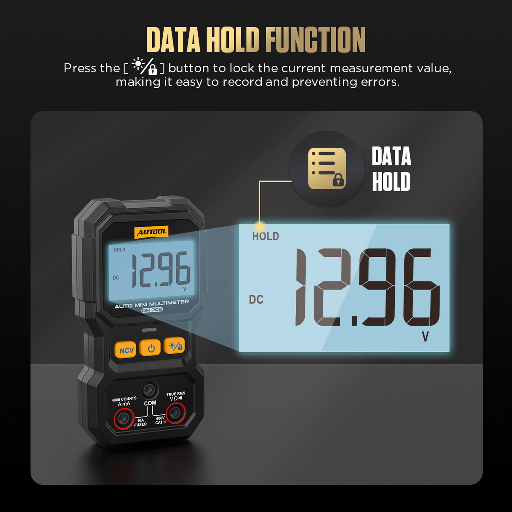 The AUTOOL DM202 supports one-click data hold and release functions, effectively preventing reading fluctuations caused by hand movement or environmental vibrations.