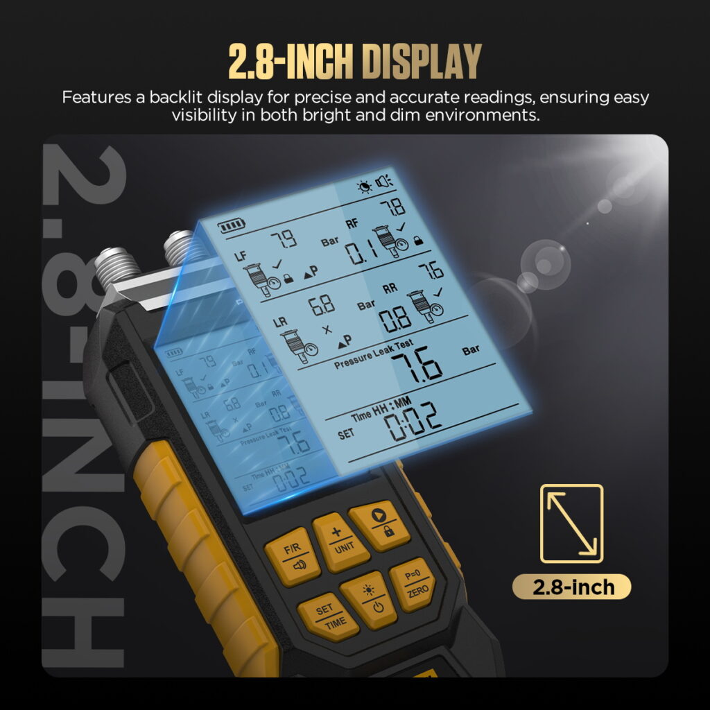 - Backlit Screen & Button Illumination: Whether in bright or dim work environments, it ensures clear visibility of pressure data, making it suitable for various usage scenarios.