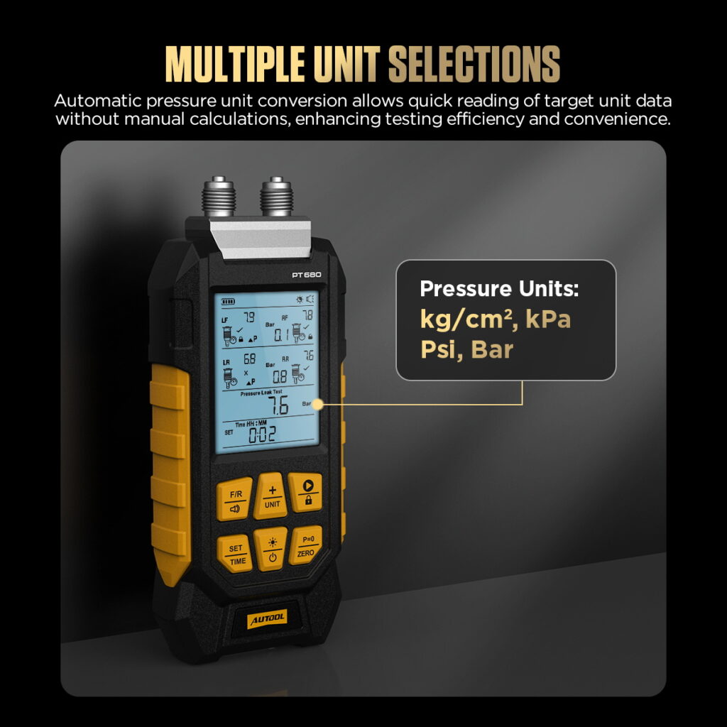 The AUTOOL PT680 supports one-click switching between kg/cm², kPa, and Bar units, eliminating the need for manual calculations. After switching, the value in the selected unit can be accurately read.