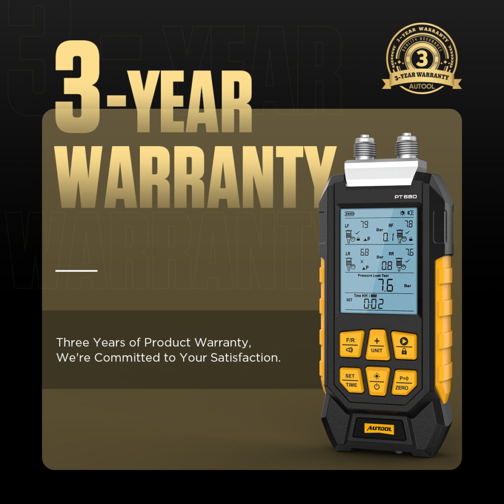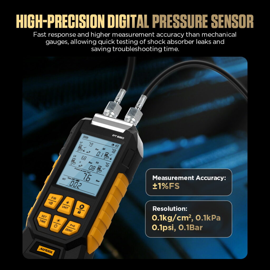The AUTOOL PT680 features a high-precision measurement with an accuracy of ±1% FS. When the vehicle experiences suspension imbalance, vehicle tilt, or unstable driving conditions, the PT680 can quickly identify leaks in the air springs, pipes, or connections within the air suspension system, ensuring the proper operation of the suspension system.