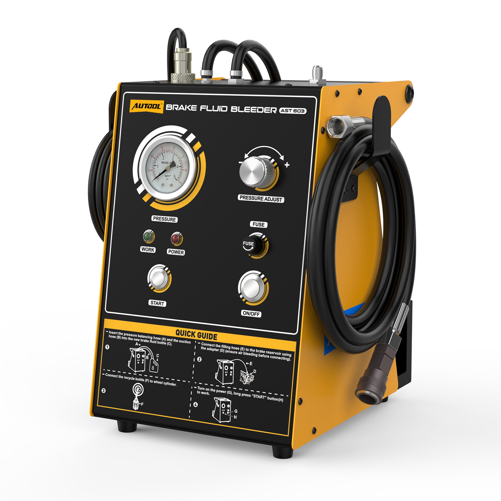 Detailed Design: The AST603 features a Pressure Gauge Display that provides real-time monitoring of the fluid replacement status. Metal Hose Fittings, crafted with precision, ensure a strong seal and long-lasting durability. The Pressure Adjustment Knob allows for real-time control of pressure levels, while the Indicator Light Design clearly shows the operational status. An Aviation Power Plug makes it easy to remove and replace the power cable, with a self-locking mechanism to prevent detachment. Additionally, the Screw Column Quick Connector enables easy removal and replacement of the filling tube.
