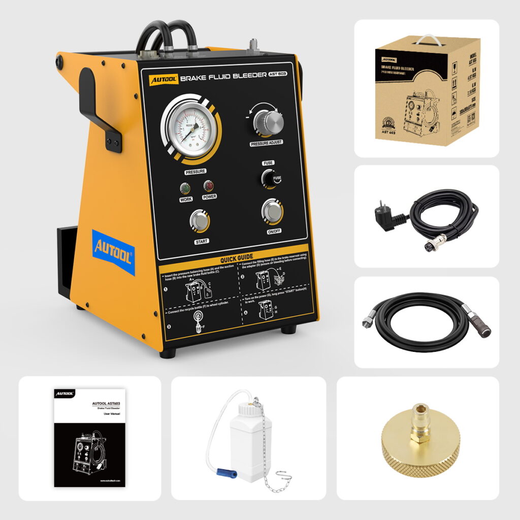 Pulse one-button Replacement: Only one person to operate. AST603 pneumatic brake bleeder allows for easy brake oil changes. The kit can change oil from two sub-pumps simultaneously. Once you set the working environment, the entire process is automatic. You don’t need to worry about being too busy.
