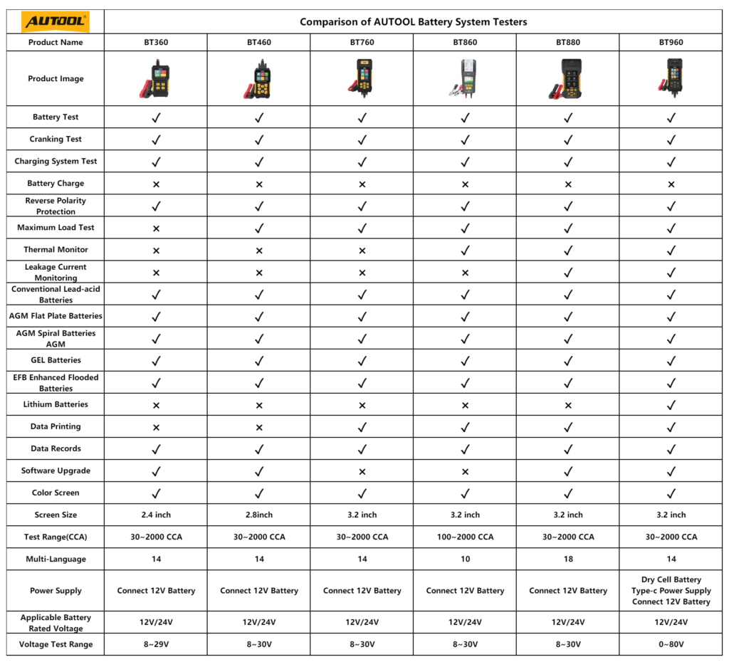 AUTOOL BT360 car battery tester is supports automotive battery testing, cranking test, and charging test functions. It is suitable for 12V battery systems and can quickly measure the health status of the battery, accurately detect common faults in the starting and charging systems. Additionally, it supports reverse polarity protection, ensuring that reverse connections won't damage the car battery checker tester or affect the vehicle and battery. However, it does not support overload testing. If you're looking for a battery tester for workshop use, we recommend purchasing the AUTOOL BT960 automotive battery tester.