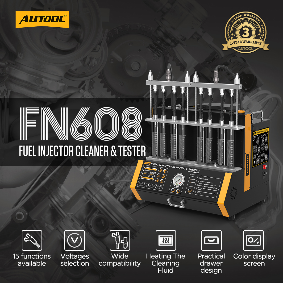The FN608 Fuel Injector Cleaner & Tester is a high-efficiency cleaning and testing machine specifically designed for eight-cylinder engines. It integrates advanced ultrasonic cleaning technology with a microcomputer-controlled oil pressure closed-loop system to deliver precise, automated performance. Equipped with a dual fuel pump design, the FN608 ensures continuous operation even if one pump fails. Its ultrasonic cleaning unit can be used independently and features a heating function that greatly enhances cleaning efficiency and results. Capable of simulating various engine operating conditions, the AUTOOL FN608 GDI Fuel Injector Cleaner & Tester supports disassembly-free and reverse cleaning, making it an ideal choice for professional technicians and large automotive repair shops.