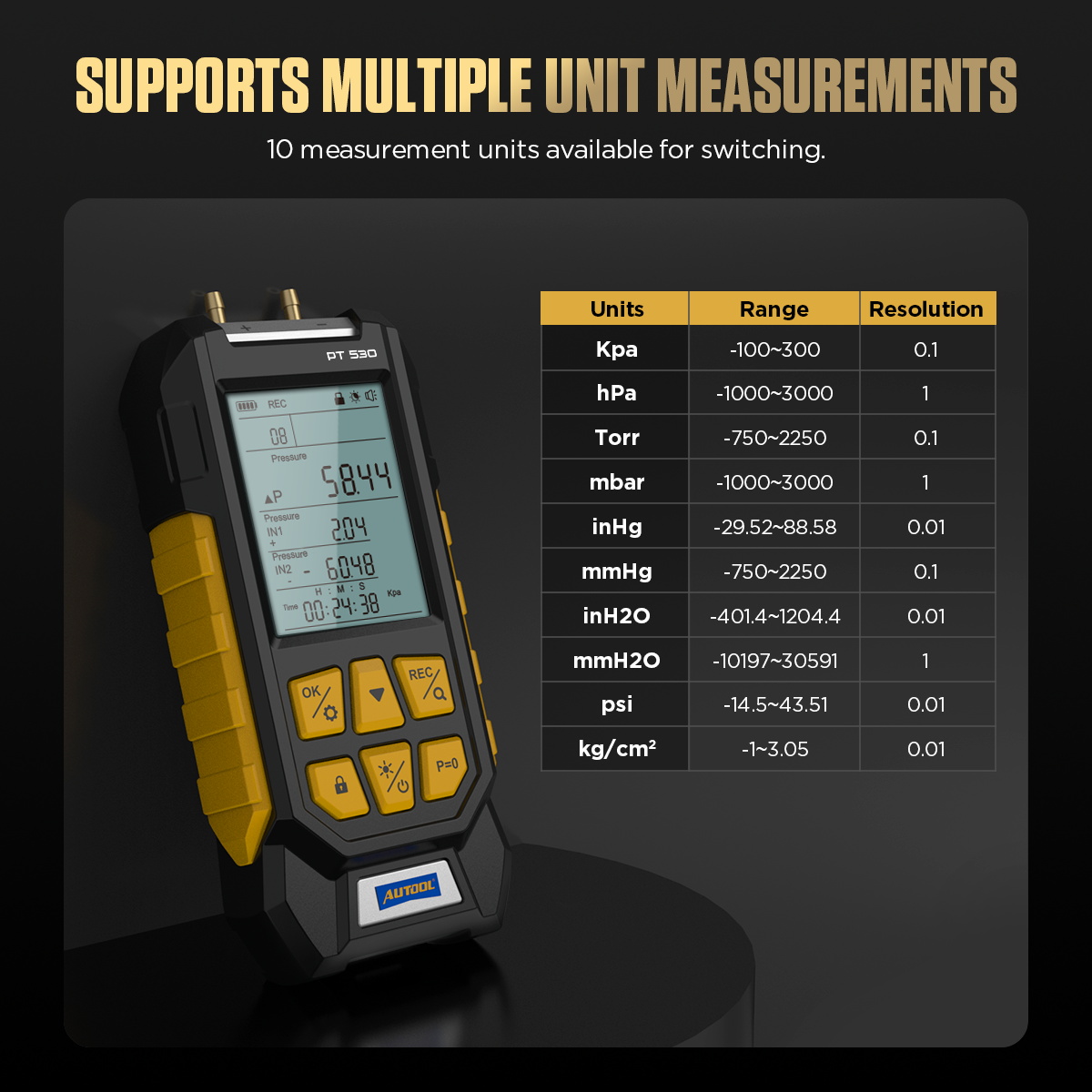 AUTOOL PT530 Digital Manometer Dual Port Pressure Gauge Features