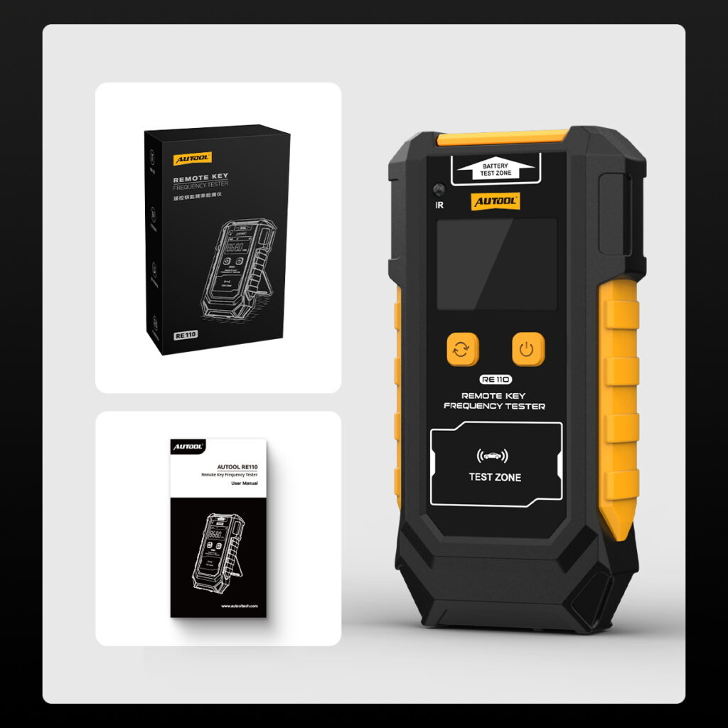 The AUTOOL RE110 Remote Key Frequency Tester uses an integrated infrared receiver module to capture the infrared light signals emitted by transmitters (such as remote controls) and convert them into electrical signals. These electrical signals are then amplified, filtered, and demodulated to extract useful frequency information. Using a frequency counter or analysis module, the frequency of the signal is calculated and checked to determine if it falls within the supported frequency range (such as 315MHz, 433MHz, 868MHz, 902MHz). The measured frequency value is intuitively displayed on the screen for the user, and alarms or notifications (such as frequency out of range) are provided.