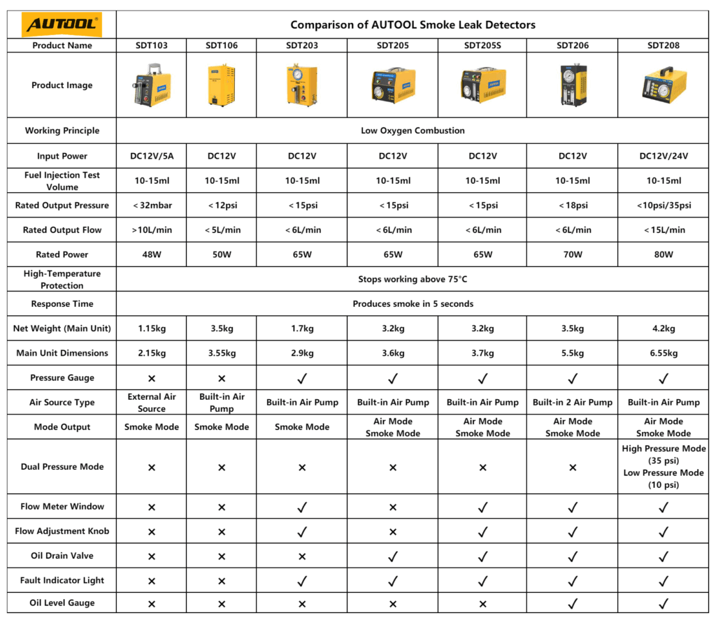 AUTOOL SDT106 Automotive Smoke Tester is specifically designed for detecting leaks in automotive pipelines, capable of accurately identifying various leakage issues in vehicle piping systems. It features a built-in air pump and a hook-style design, enhancing the convenience and speed of leak detection. Additionally, it offers overheat protection for your safety. Its compact and portable design makes the detection process faster and more convenient.