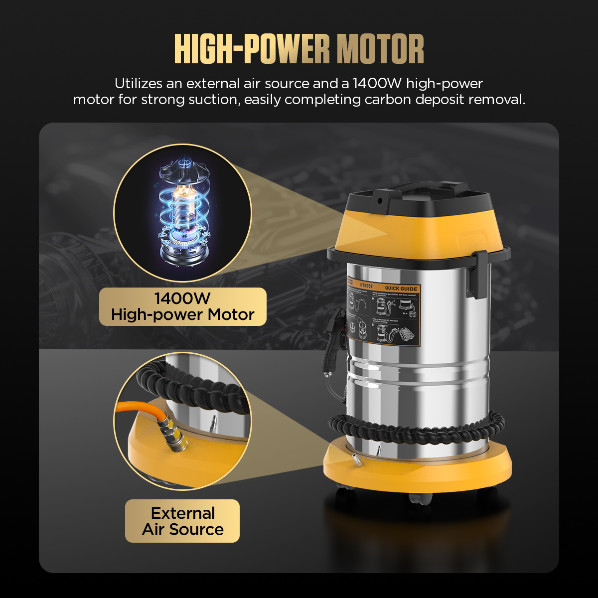 External Air Source Design: The walnut shell engine cleaning tool is powered by a robust 1400W high-performance motor, which uses an external air source to provide continuous power. This enhances the impact force of the walnut shell abrasive, ensuring thorough removal of carbon deposits from the engine pipes.