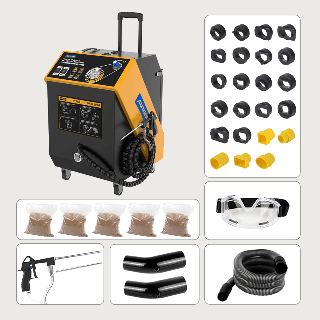 The AUTOOL HTS678 Walnut Shell Sand Blaster is a car engine carbon deposition cleaning equipment with adjustable output air pressure. The Walnut Blaster uses harmless walnut shell abrasive to deeply clean carbon deposits in the intake manifold and valves, effectively resolving issues such as unstable idle, incomplete fuel combustion, and increased engine oil consumption. The AUTOOL HTS678 Walnut Blasting Machine features a 1800W motor and an adjustable pressure knob, providing strong suction power and flexible air pressure regulation. It is also equipped with 23 connectors suitable for various vehicle models, meeting the cleaning needs of different workshops.