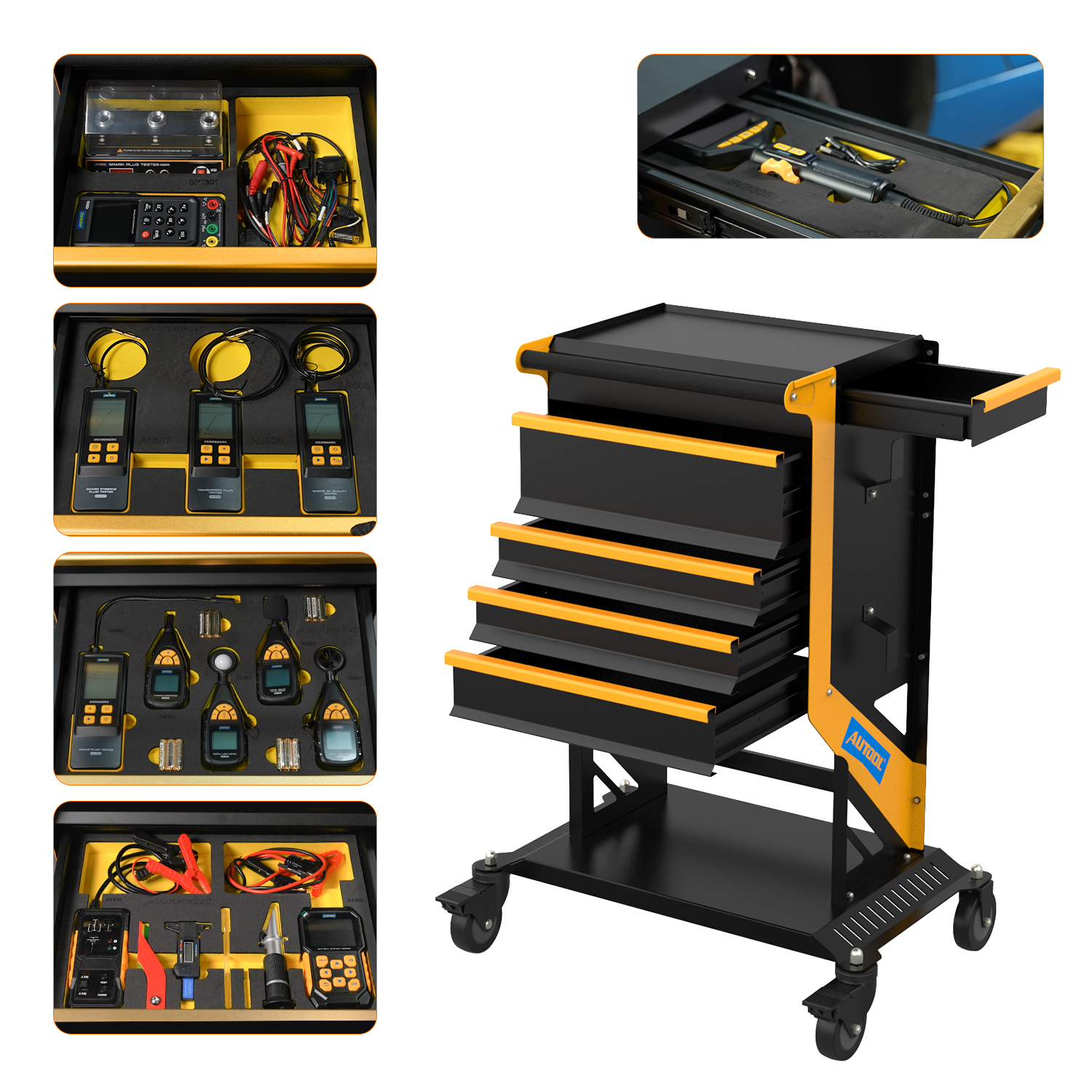The AUTOOL S1 Diagnostic & Repair Kit is suitable for repair shop users. Workshop testing kit for repairing instruments and equipment with diverse load functions, using the AUTOOL T27 as the carrier. It features a complete set of equipment and is convenient and efficient. AUTOOL uses high-quality steel to build the T27 workshop tool trolley, which rotates 360 degrees for easy movement and storage. Its multi-compartment storage system includes four spacious drawers and a top compartment, providing ample space for tools and spare parts. Thick cold-rolled steel plates give this tool cart a maximum load capacity of 100 kilograms, ensuring safety and durability. The kit includes 26 workshop testing devices, such as the AS oil analyzer, SVB endoscope, SPT spark plug tester, humidity, wind speed, brightness, and decibel tester, DM303 multimeter, battery clamp leads, and more inspection equipment, can be used as a large mechanic tool box.to meet your diverse testing needs.
