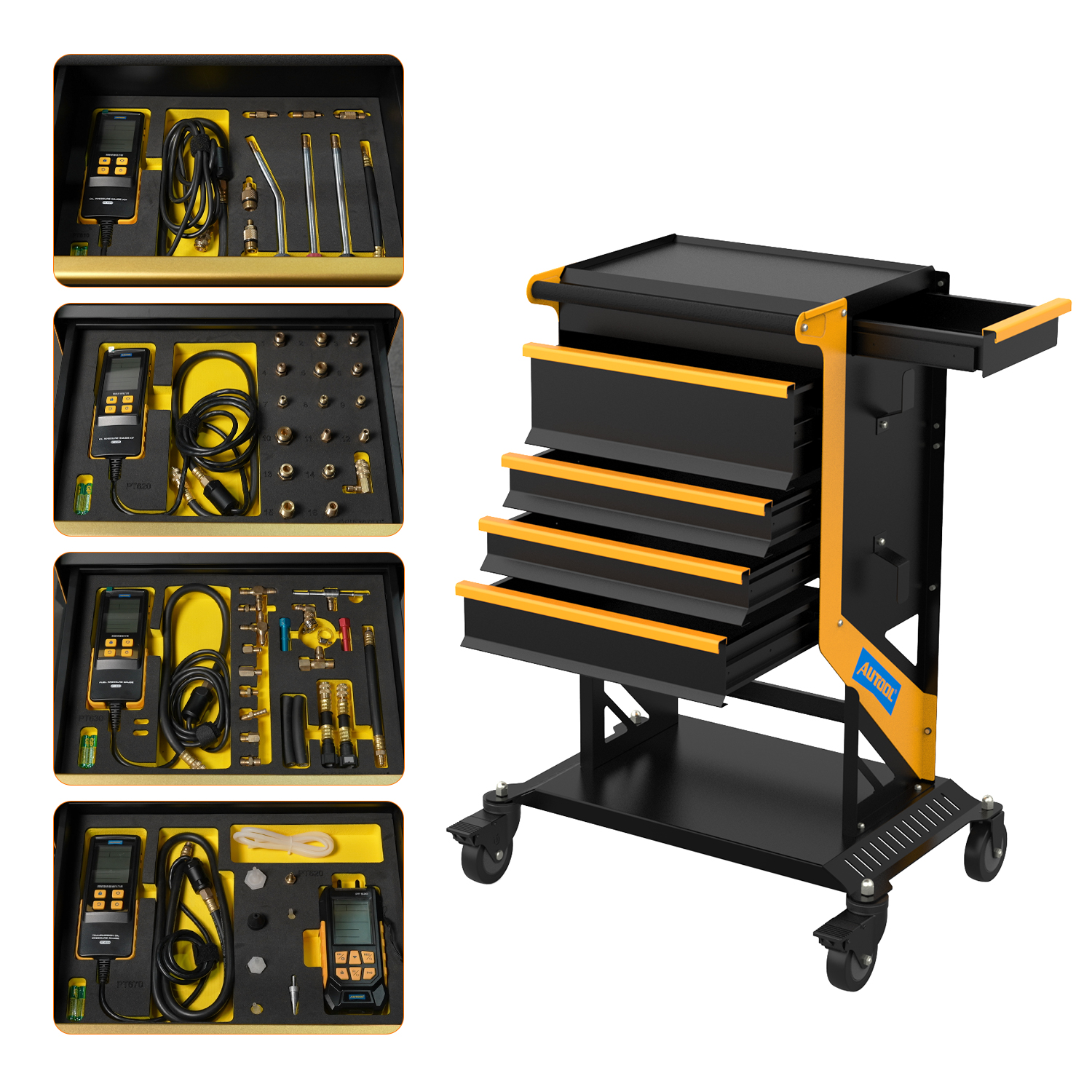 AUTOOL S2 Automotive Pressure Test Kit & Rolling Tool Cart combines four professional Automotive Pressure Test Kits (PT610, PT620, PT630, and PT670), covering testing needs for engine, fuel, lubrication, exhaust, and air conditioning systems. The versatile quick connectors precisely capture pressure changes for efficient and accurate fault diagnosis. Built with reinforced cold-rolled steel and a corrosion-resistant powder coating, it supports up to 100 kg and requires no assembly. Smooth sliding rails, dual-sided hooks, rear storage space, and anti-slip casters ensure convenient tool access and flexible mobility—making it the ideal choice for automotive inspection and maintenance.